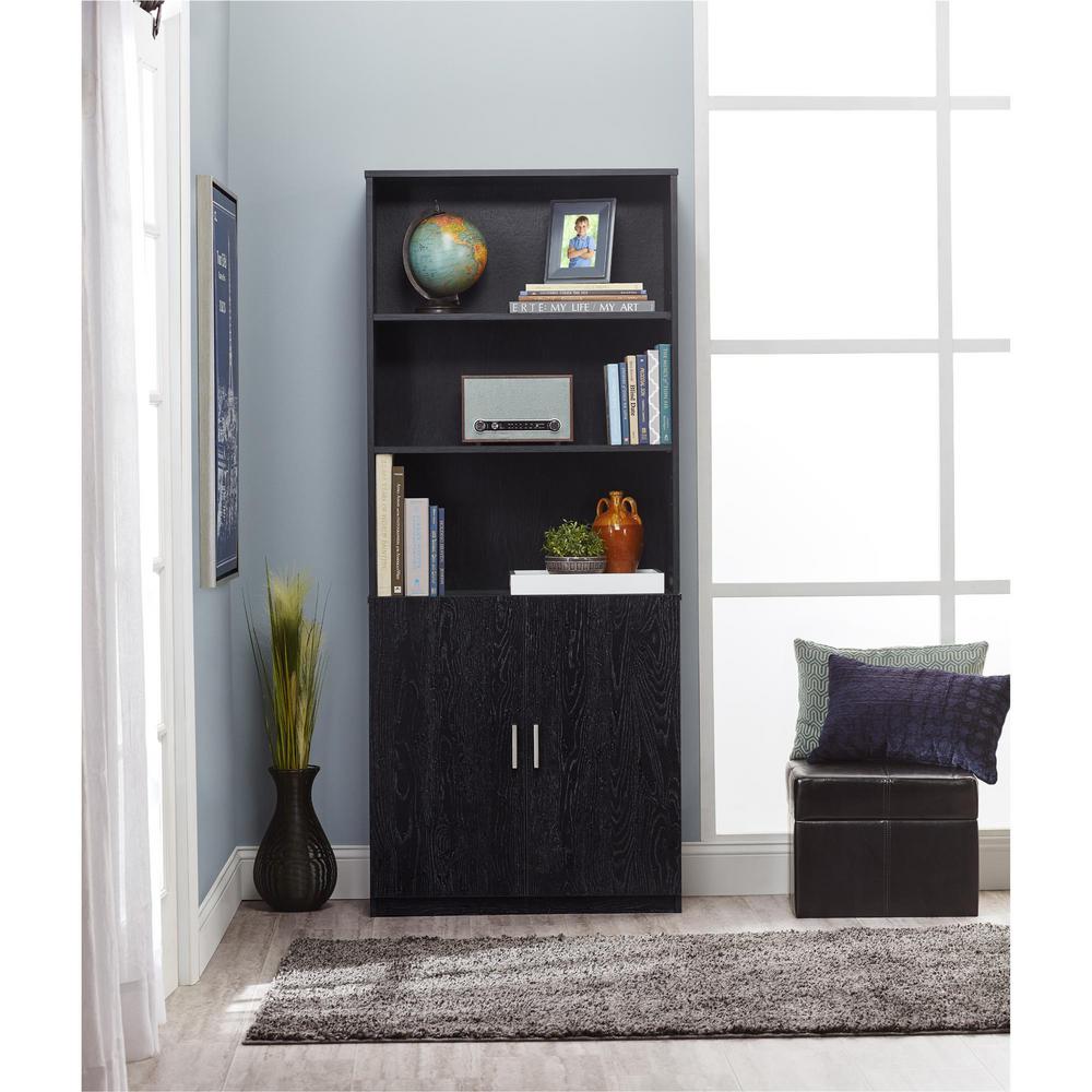 A billy bookcase with glass doors and a black trim, also available on ikea.
